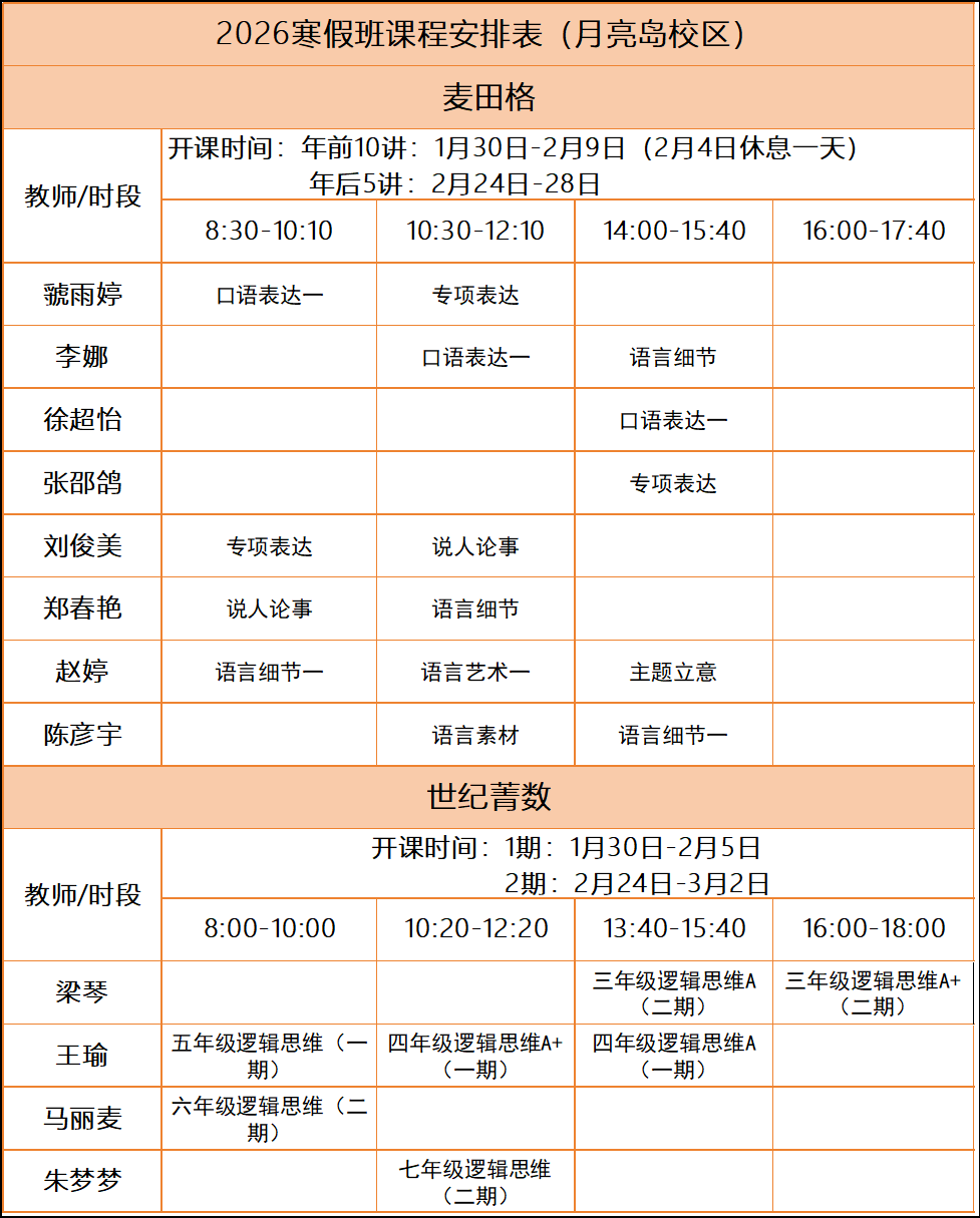 【寒假班课程安排】3499拉斯维加斯2026年月亮岛校区寒假课表